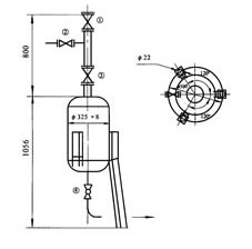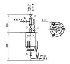 4、當(dāng)檢修或吹掃時(shí),關(guān)閉閥①或在閥后堵盲板,從閥②接蒸汽或氮?dú)獯党?br> 5、本排水器接管法蘭為JB81-59、PN1.6 DN50。